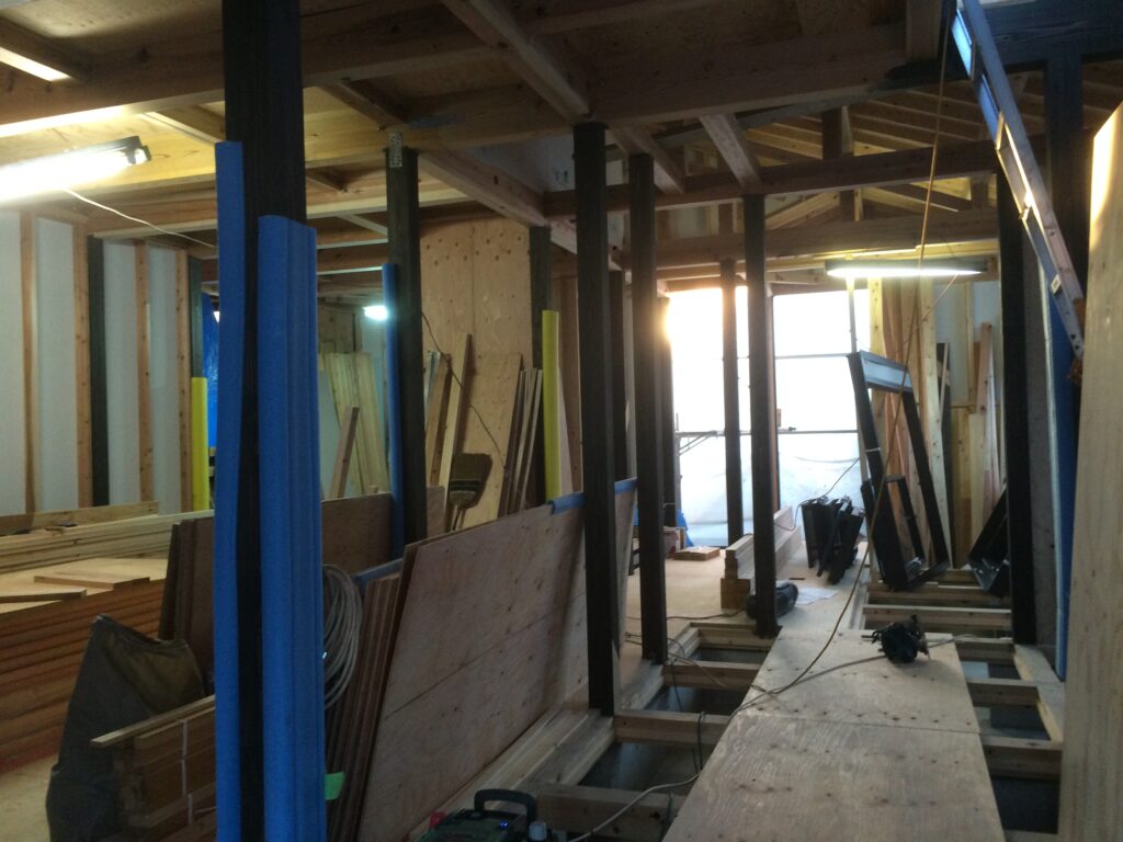 内部も間仕切り壁の下地になる間柱が立ち出して部屋の輪郭が見えてきました。
