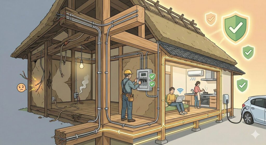 リノベーションのタイミングで電気配線をやりかえることは、ただの設備更新ではなく、未来の安心・安全をつくるための選択です。古民家など歴史ある建物の魅力を活かしながらも、現代の暮らしに合わせたアップデートを行うことで、住まいはもっと快適に、もっと長持ちします。
