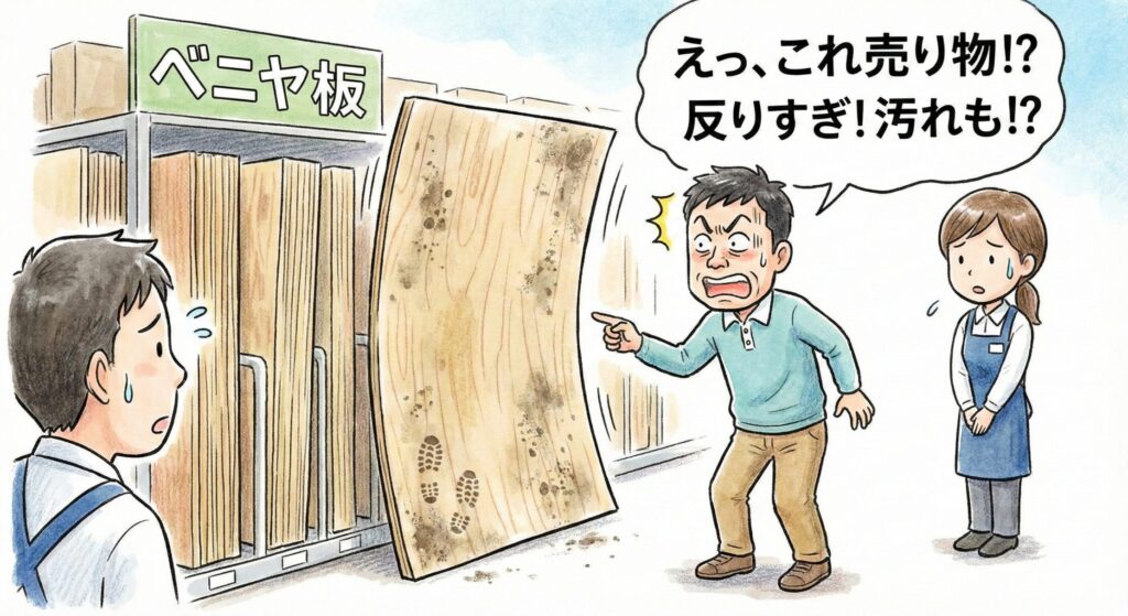 最近では、プロ向けのホームセンターもあります。工務店さんや大工さん、そのほかの工事業者さんも材料の調達にホームセンターを利用します。ベニヤ板の山が荒れている場合は、そのような業者さんたちがきれいなベニヤ板を選ってもってしまったあとかもしれないので、上から必要枚数取るのでなくて、一枚ずつ選ぶようにしたほうがいいです。