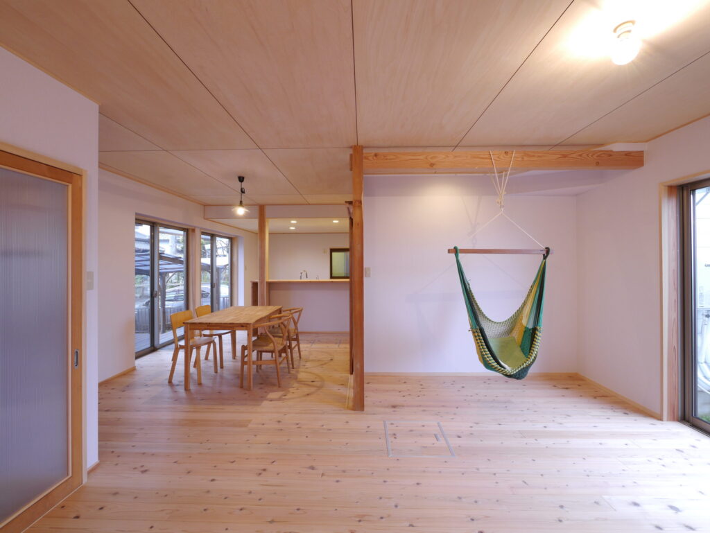 施工実例では、シナベニヤを天井全面に使ったリビングが好評。明るい木のトーンが空間全体をやわらかく包み込み、昼も夜も居心地のいい空間になります。