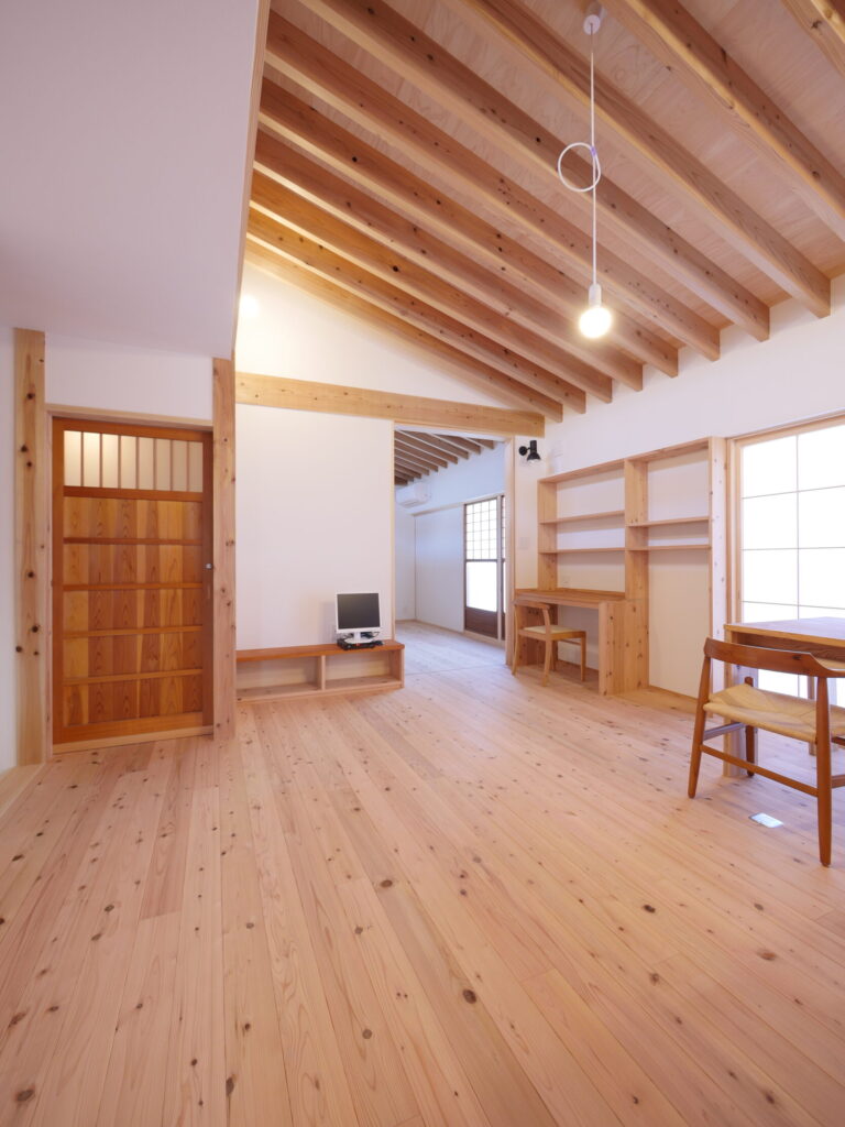 例えば、壁は漆喰、天井にベニヤ、床は無垢フローリングという組み合わせ。色味をそろえることで、自然素材ならではの優しさと統一感が生まれます。