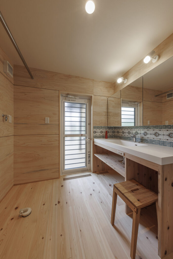 また、モルタルのグレーとベニヤの木目の対比もおしゃれ。少し無機質な素材に、木の温もりを加えることでバランスが取れて、飽きのこないデザインになります。