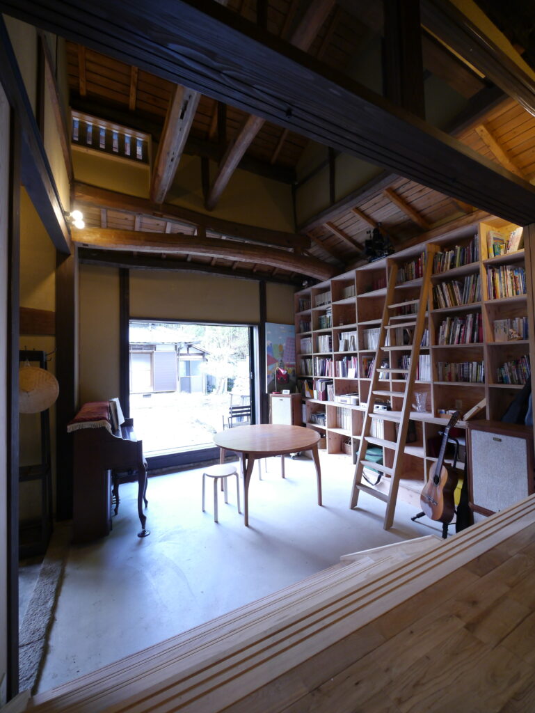 ・玄関は広土間を改めて作り直し、壁一面の本棚を設置し