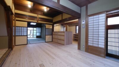竣工時。過去の写真などをもとに市役所文化財課さんから外観の確認をいただいて施工しました 工事前の建物。昭和期にいろいろな改修工事が施されていました 玄関土間。写真中央のガラス戸は、当社在庫の古建具を調整して … 続きを読む 大阪府富田林市の町家再生